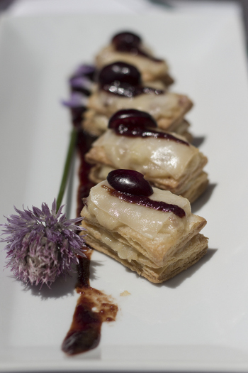 - Milhojas de cebolla con queso de los Ibores y chutney de Cereza del Jerte