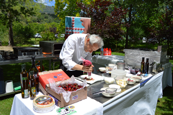 En una cocina al aire libre en el Hotel Balneario Valle del Jerte, en Valdastillas, y con un tiempo inmejorable, Jesús Almagro nos preparó dos platos: «Pieza de cordero confitado con queso líquido de La Serena, confitura de picotas y migas extremeñas» y «Picota sobre picota», un espectacular postre en el que las picotas estaban presentes de todas las maneras posibles.