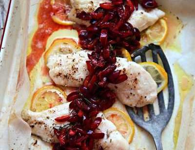 Finalmente, se retira del horno y se coloca sobre cada lomo de pescado o pieza completa una cucharada generosa de la salsa de cereza.