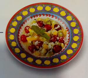 Finalmente, se baña el arroz con infusión de menta fría y se añaden las cerezas.